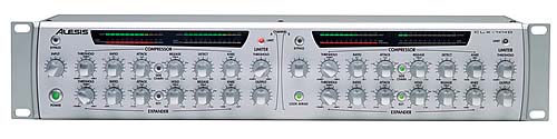 Front Panel: Rear-illuminated power switch, Input trim x2, Compressor Threshold x2, Expander Threshold x2, Compressor Ratio x2, Expander Ratio x2, Compressor Attack x2, Expander Attack x2, Compressor Release x2, Expander Release x2, Compressor Knee x2, Expander Release x2, Compressor Detect x2, Expander Detect x2, Limiter Threshold x2, Output trim x2, Limit LED x2, Rear-illuminated Sidechain engage x2, Rear-illuminated Key engage x2, Rear-illuminated Look-ahead engage, 12-segment Input LED display x2, 12-segment Output LED display x2, 12-segment Compression LED display x2, 12-segment Expansion LED display x2, Rear-illuminated Bypass engage x2