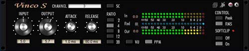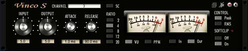Like the legendary models, the ratio is adjustable in five stages from 2:1 to 20:1. The input control automatically sets the threshold and compensates the gain accordingly so you can focus completely on using the Attack and Release controls to get the sonic effect. With the large VU meters in vintage style you can easily monitor the signal strength (RMS). To monitor signal peaks you can switch the view to a precision LED chain with Peak Hold, as well as Margin and Gain Reduction displays. Vinco contains Creamware SoftClip algorithm as an insertable option to simulate analog tape saturation, or for soft control of digital overs. It also features sidechain inputs to allow another signal to control the dynamics. |