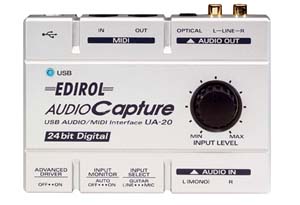 ![]() The unit can accept input from Mic, Line and even guitar level signals. The audio is converted at 24-bit quality and is transferred to your computer via industry standard low latency ASIO, MME, WDM drivers for compatibility with all major sequencing platforms, the input signal may be also monitored directly in hardware.Outputs include analogue, digital and headphone. The built-in MIDI in and out utilize Edirol's Fast Processing Technology for super accurate MIDI timing with any sequencing software on Mac or PC platforms and can be used with both OMS or FreeMIDI drivers on the Apple Macintosh. The UA-20 requires no external power supply and can be utilized by mobile laptop or Powerbook users. The unit ships with drivers for Windows 98, 2000, Me, XP and Mac OS 8.5, 9.x and may also be used with the native USB audio drivers that are included with both Mac & PC.