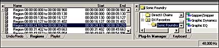 Sample Editing Pop-up MIDI keyboard to test samples Sustaining Loop Release Loop Real-time loop tuning window Generate/Receive MIDI Time Code SCSI/SMDI or MIDI/SDS sample transfer Sustaining Loop, Release Loop Recording Auto calibration for DC Offset Generate SMPTE/MIDI Time Code Glitch/Gap Detection Punch In option Real-time record meters Remote record function Timing Basis Absolute Frames Measures and Beats Samples, Time, Seconds SMPTE Drop/Non-Drop SMPTE EBU/Film Sync Time and Frames Video Support FREE Vegas Video 3.0 LE Enhanced video preferences New option to compensate for non-square pixels in Video preview window Display exact video frame animation above waveform .MOV and MPEG-1 and MPEG-2 (MPEG-1&2 support requires the purchase of the MainConcept MPEG plug-in) format import Windows Media Video format import External monitor support using DV and IEEE 1394 devices Maintain perfect sync while working with full NTSC and PAL video Sound and video synchronization with sub-frame accuracy Various video and audio compression options Supported File Formats (open and save), Extension AIF/SND: Macintosh AIFF AU/SND: NeXT/Sun (Java) (PCM, µ-Law) AVI: Microsoft Video for Windows DIG/SD: Sound Designer 1 IVC: Intervoice (ADPCM, µ-Law, A-Law) MOV: Apple QuickTime Movie MP3: MPEG-1 Layer 3 (Audio) MPG (MPEG-1&2 support requires the purchase of the MainConcept MPEG plug-in): MPEG-1 or MPEG-2 Video OGG:Ogg Vorbis PCA: Sonic Foundry Perfect Clarity Audio RAW: Raw Files (8- and 16-bit data: signed, unsigned, and Motorola and Intel byte ordering) RM: RealNetworks RealAudio 8.0 (only save) RM: RealNetworks RealVideo 8.0 ( only save) SND: Sounder/SoundTool VOX:Dialogic VOX (ADPCM) W64: Sonic Foundry Wave 64 WAV: Microsoft Wave WMA: Microsoft Windows Media Format WMV: Microsoft Windows Media Video